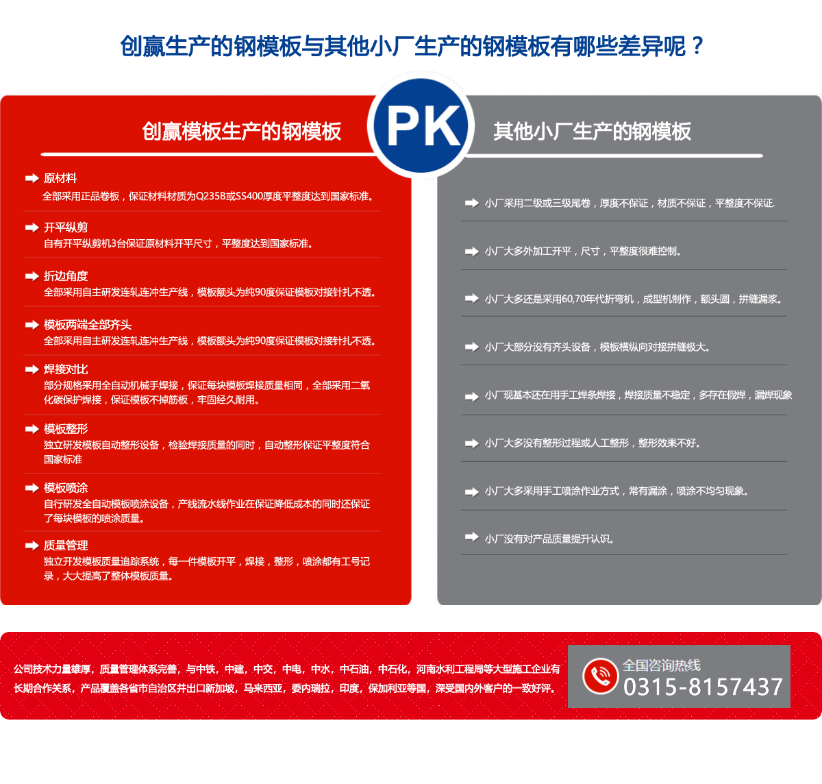 唐山創(chuàng)贏模板有限公司(原唐山豐南雙贏金屬結(jié)構(gòu)廠)始建于一九九七年,是具規(guī)模實(shí)力的組合模板生產(chǎn)企業(yè)。公司技術(shù)力量雄厚,質(zhì)量管理體系完善,與中鐵,中建,中交,中電,中水,中石油,中石化,河南水利工程局等大型施工企業(yè)有長(zhǎng)期合作關(guān)系,產(chǎn)品覆蓋各省市自治區(qū)并出口新加坡,馬來(lái)西亞,委內(nèi)瑞拉,印度,保加利亞等國(guó),深受國(guó)內(nèi)外客戶的一致好評(píng)。